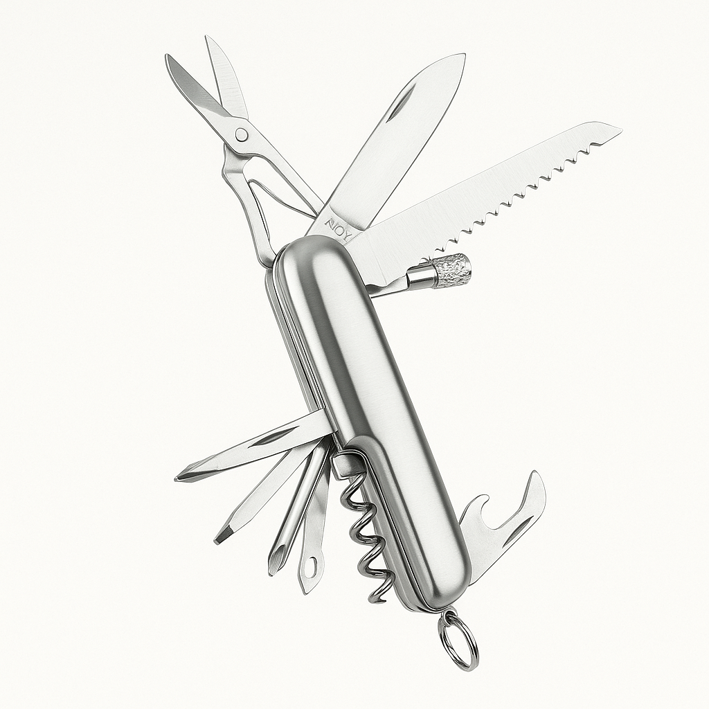 Navaja de bolsillo con 11 funciones. Incluye tijeras, serrucho, sacacorchos, destapador, desarmador con punta de cruz, desarmador con punta plana, navaja grande, 3 navajas chicas, lámpara de 1 LED con 3 baterías de botón (incluidas), llavero y funda.
