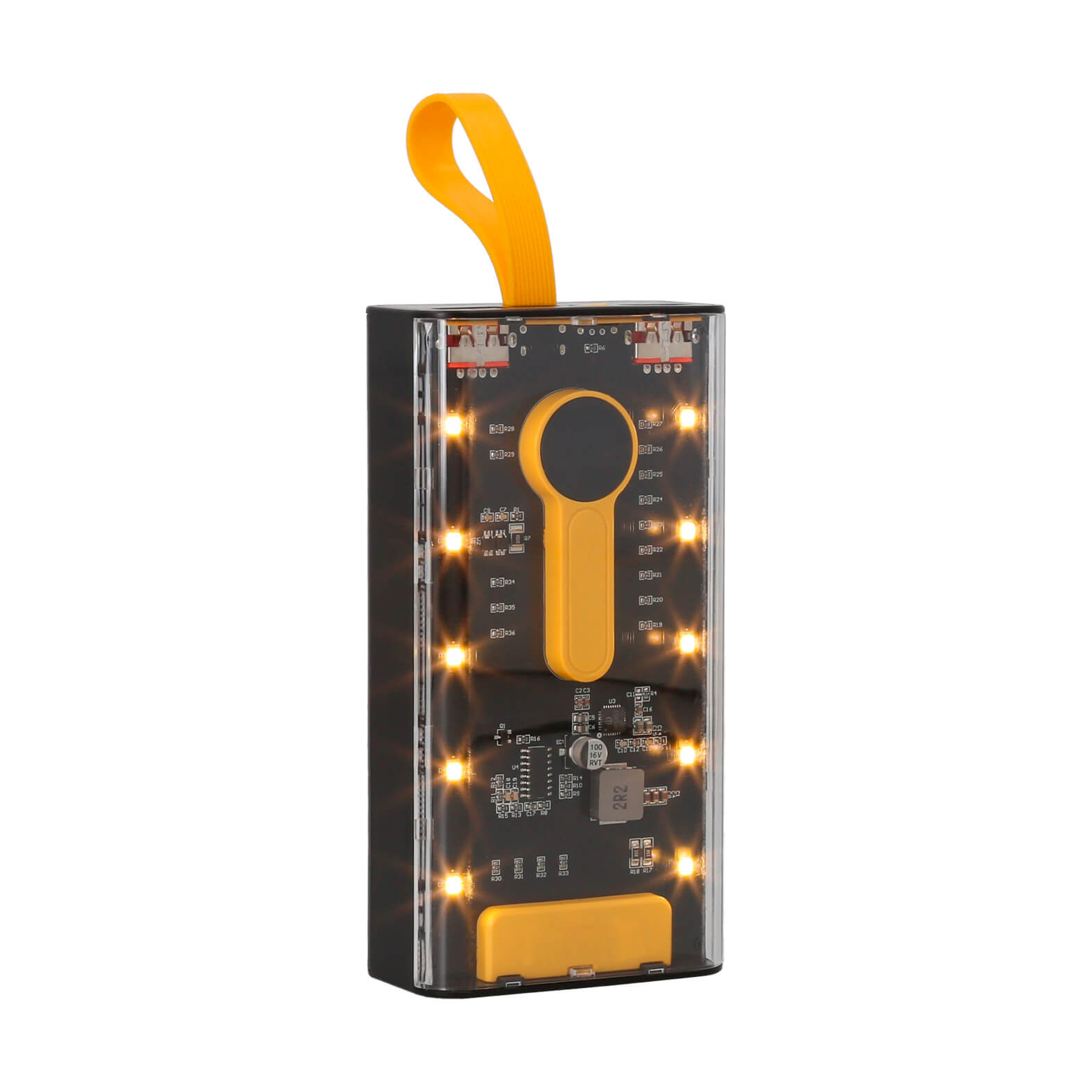 Power Bank transparente de 20,000 mAh con 2 entradas USB, 1 tipo C, botón de encendido o apagado, incluye cables para dispositivos de entrada USB, micro USB, tipo C y lightning, medidor de carga y 4 tipos de luz que sirven como lámpara. Material: Plástico Capacidad: 20,000 mAh