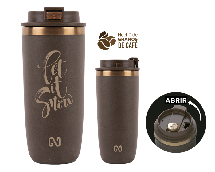 Termo NAYAD NEO de 16 Oz. de doble pared, la interna de acero inoxidable y externa de granos de café reciclado, con una duración de 3 hrs bebidas calientes y 5 hrs. bebidas frías. Este termo es biodegradable, amistoso con el medio ambiente; tiene un cintillo metálico color bronce que le dan gran estilo y personalidad. Cuenta con tapa de rosca hermética antiderrames, para abrir hay que quitar el candado de seguridad y girar la tapa superior hacia la izquierda. Libre de BPA, CAP. 480 ml. Presentación: Caja de color.