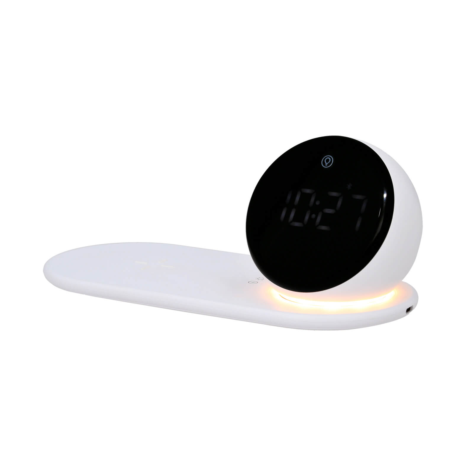 Cargador inalámbrico con alarma digital, bluetooth, bocina y lámpara de noche con tres modalidades. Incluye cable de carga tipo C. Material: Plástico